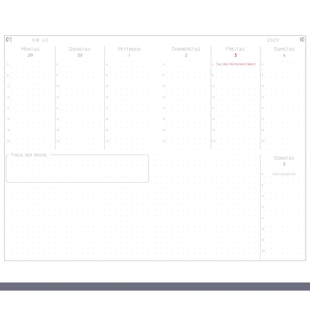 Die Tage stehen nebeneinander, jeweils mit übersichtlicher Zeitleiste – ideal, um Termine und Aufgaben schnell einzutragen und den gesamten Wochenablauf auf einen Blick zu erfassen.