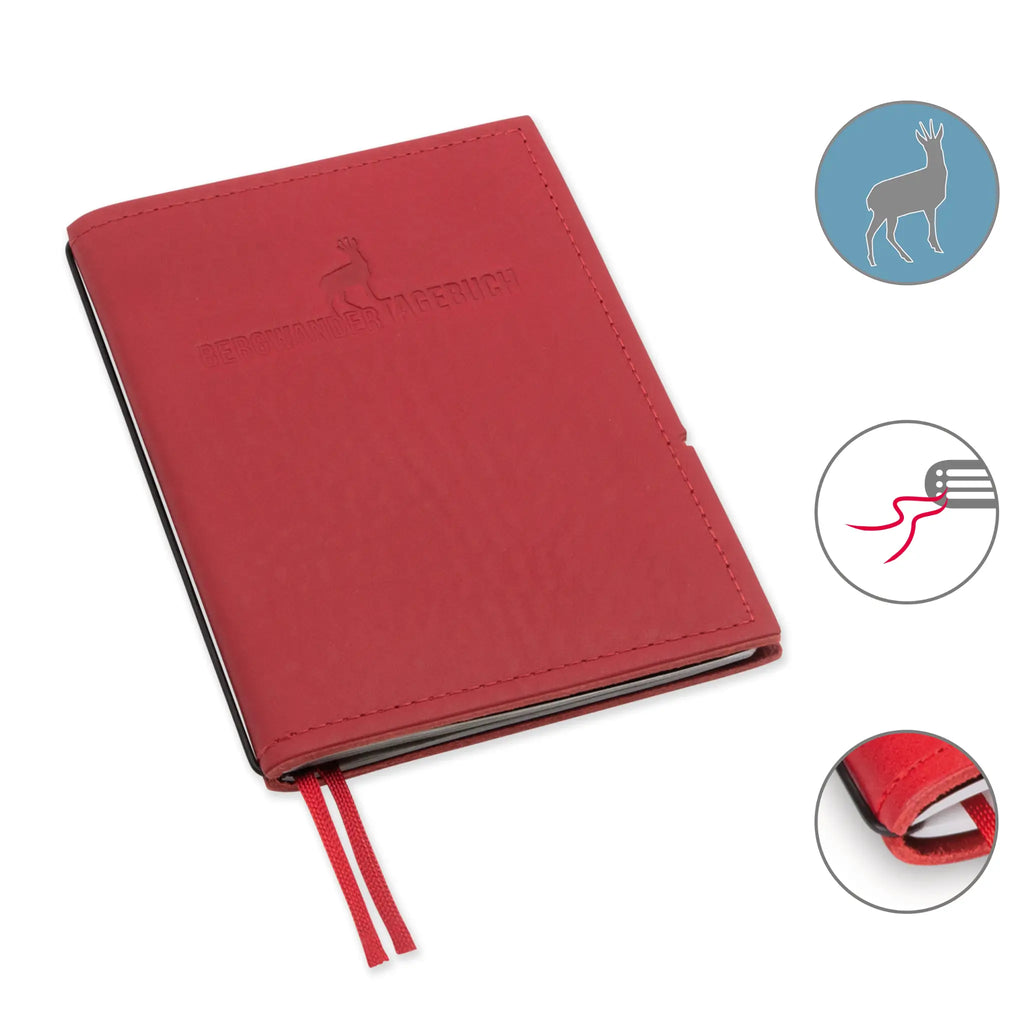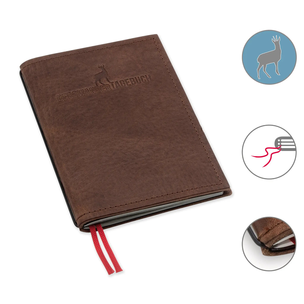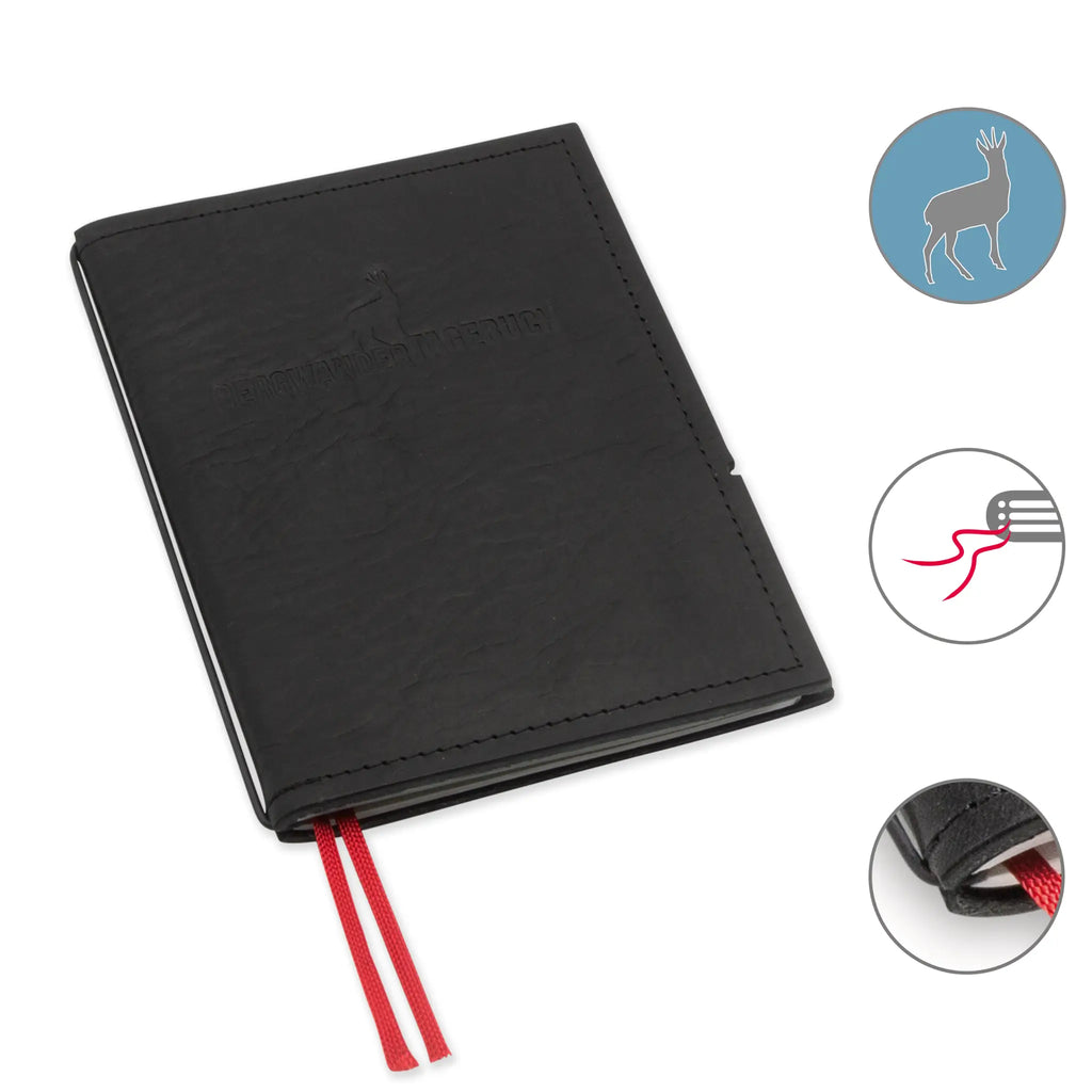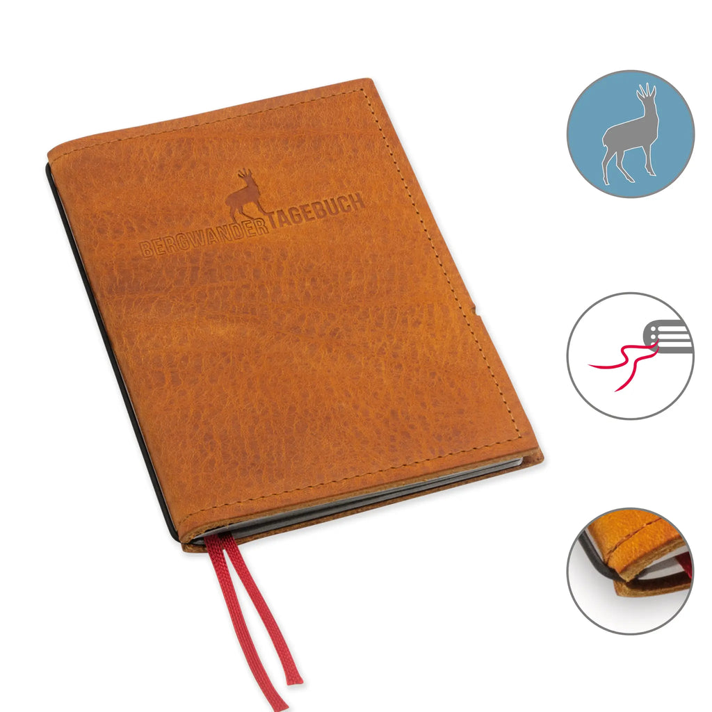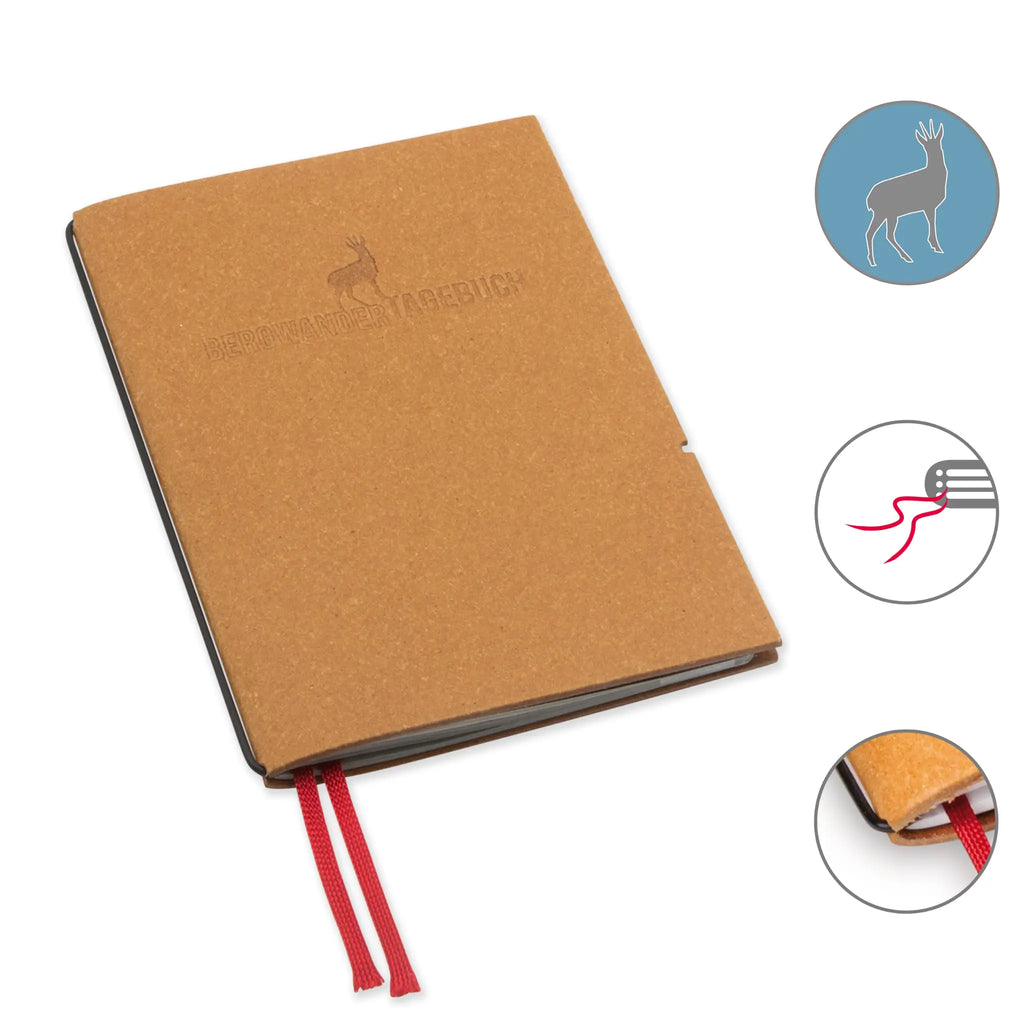 Dokumentiert eure Bergabenteuer mit dem A6 Bergwandertagebuch – entworfen von Grafikdesignerin Henrike Kreck. Das praktische Notizbuch bietet vordefinierte Felder für Tour, Start, Ziel, Datum, Kilometer, Höhenmeter, Wetter, Schwierigkeitsgrad und persönliche Bewertung. Mit strapazierfähiger Hülle und einem austauschbaren Heft begleitet es euch ein Leben lang. Endlich ein Wandertagebuch, das eure Erlebnisse übersichtlich und dauerhaft festhält.