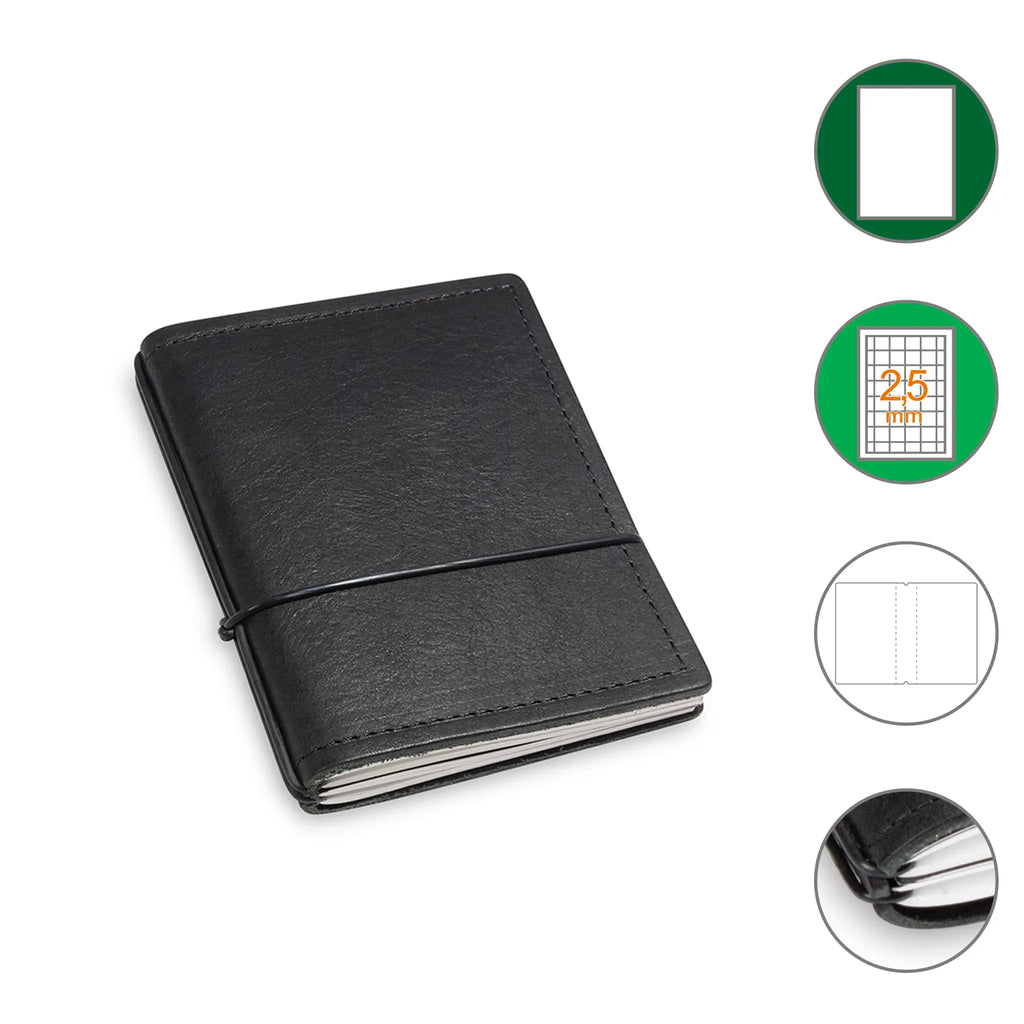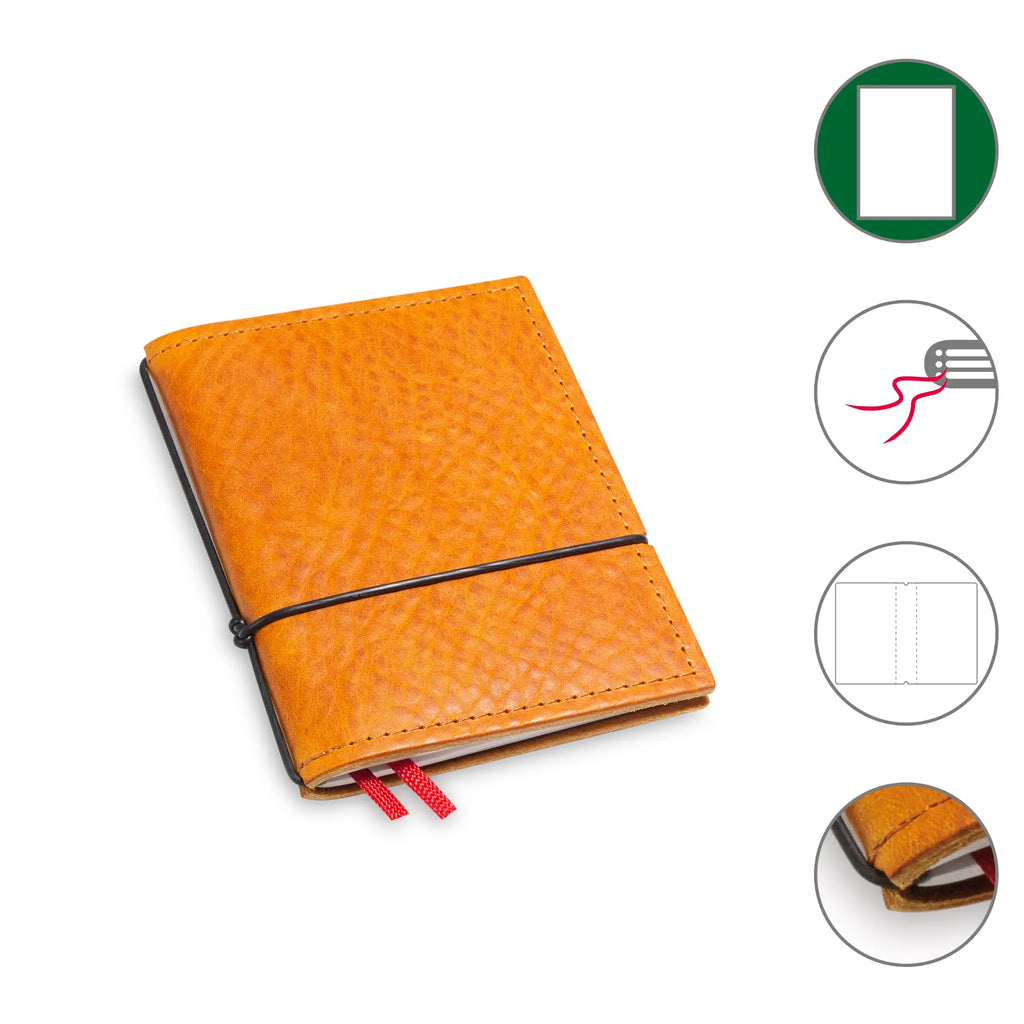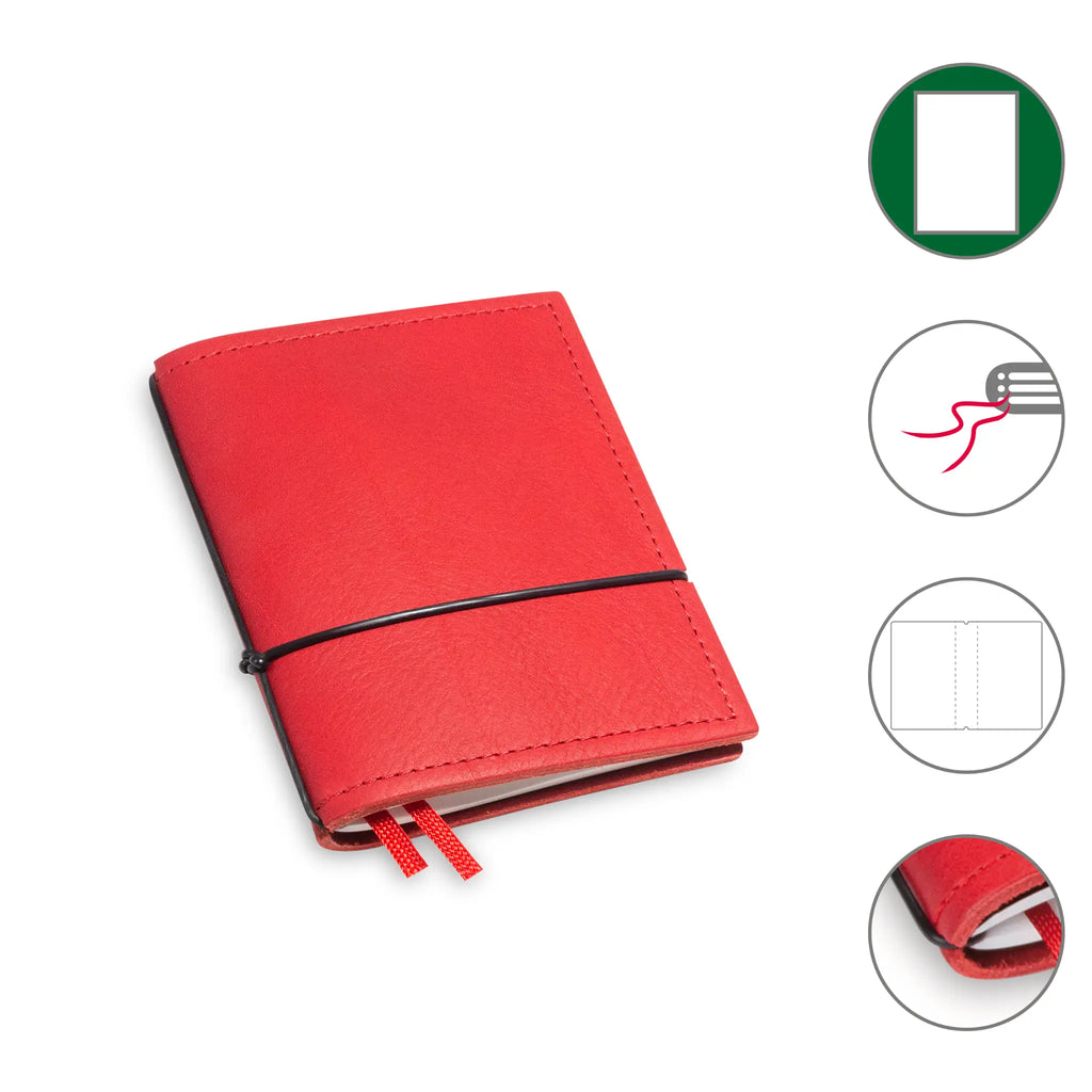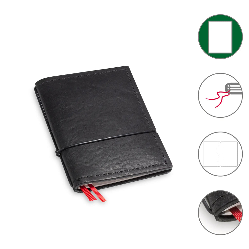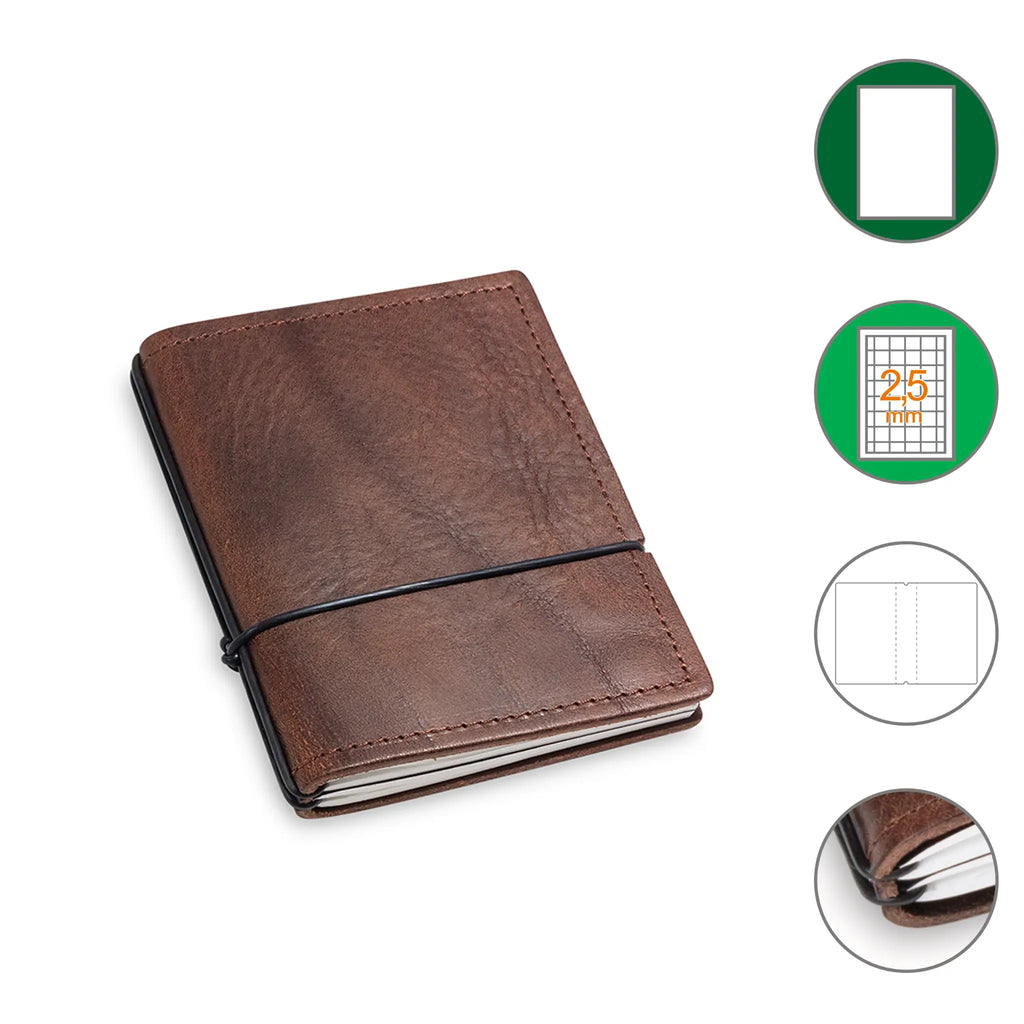 Dieses äußerst kompakte A7 Notizbuch passt problemlos in Gesäß- oder Hemdtasche und ist somit ideal für den mobilen Gebrauch. Wählen Sie zwischen einer oder zwei Einlagen, um Ihren individuellen Bedürfnissen gerecht zu werden. Perfekt, um Gedanken und wichtige Notizen jederzeit griffbereit zu halten.