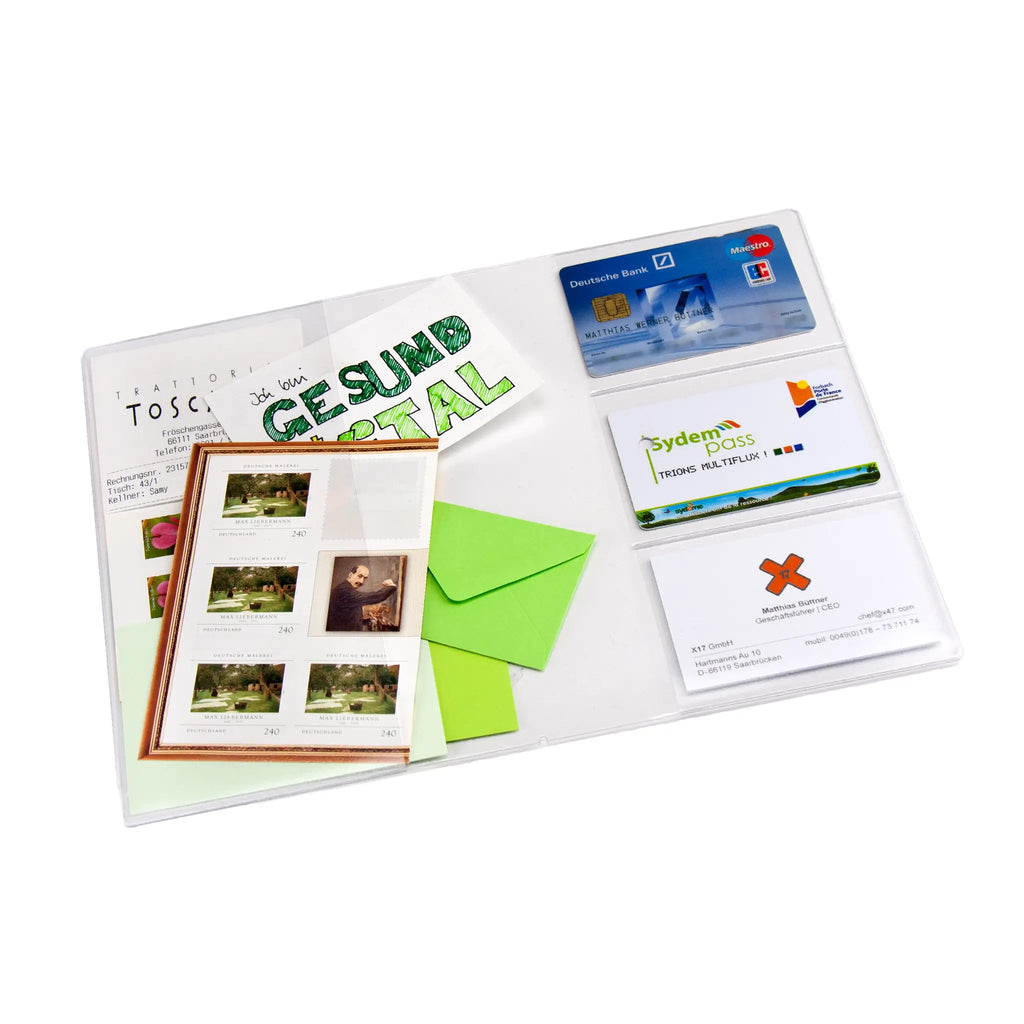 Die Doppeltasche A5 verfügt beidseitig über praktische Fächer: entweder drei kleine für Visitenkarten auf der einen Seite und ein großes Einsteckfach für Belege und Fotos auf der anderen oder umgekehrt. Sie lässt sich bequem hinter einem Heft platzieren und hilft dabei, wichtige Dokumente übersichtlich zu organisieren und schnell griffbereit zu haben.
